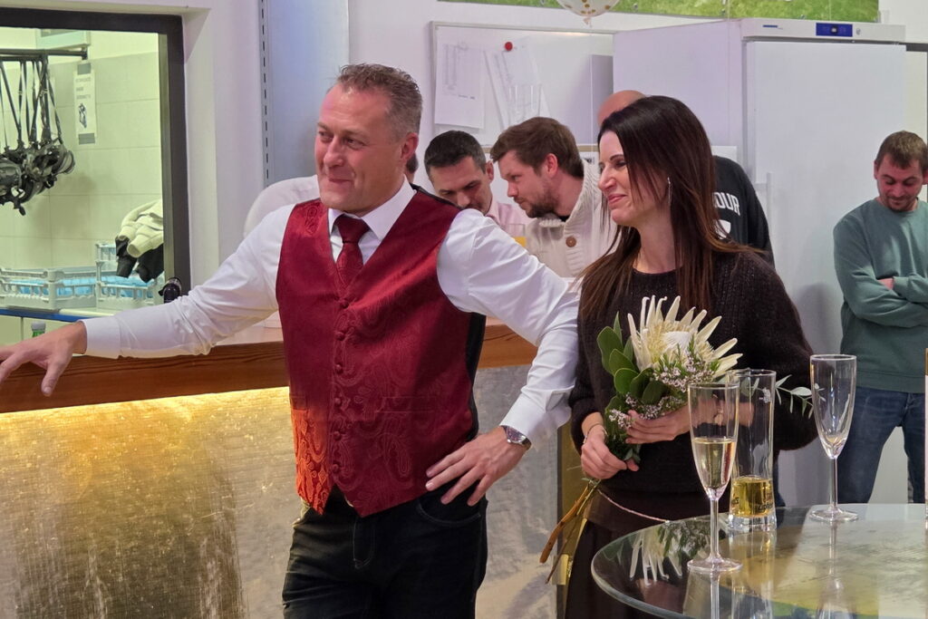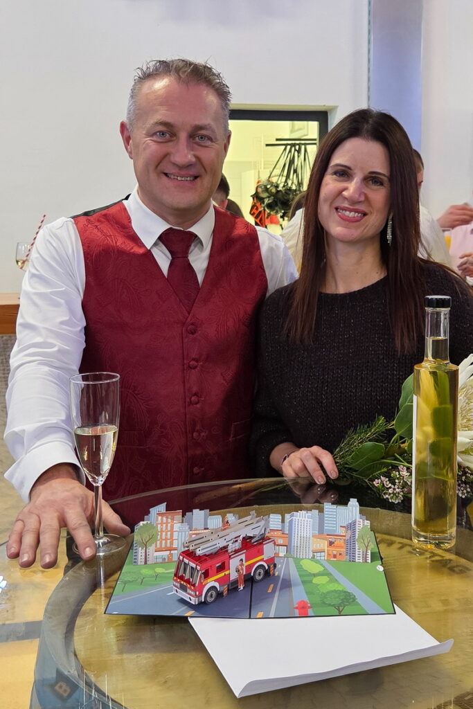 Natürlich kamen die Feuerwehren nicht mit leeren Händen. Es konnte ein stattlicher Betrag für einen Thermenaufenthalt für Manfred und seine Gattin Mariella gesammelt werden. Abschnittsfeuerwehrkommandantstellvertreter Werner Braun und der Leiter des Verwaltungsdienstes im Abschnittsfeuerwehrkommando VI Gerald Pany überreichten dem Paar den Gutschein, allerdings musste zuvor eine ‚kleine‘ Aufgabe von beiden bewältigt werden. Danach gratulierten die Mitglieder vom Abschnittsfeuerwehrkommando Stockerau und Korneuburg dem frischgebackenen 50iger.