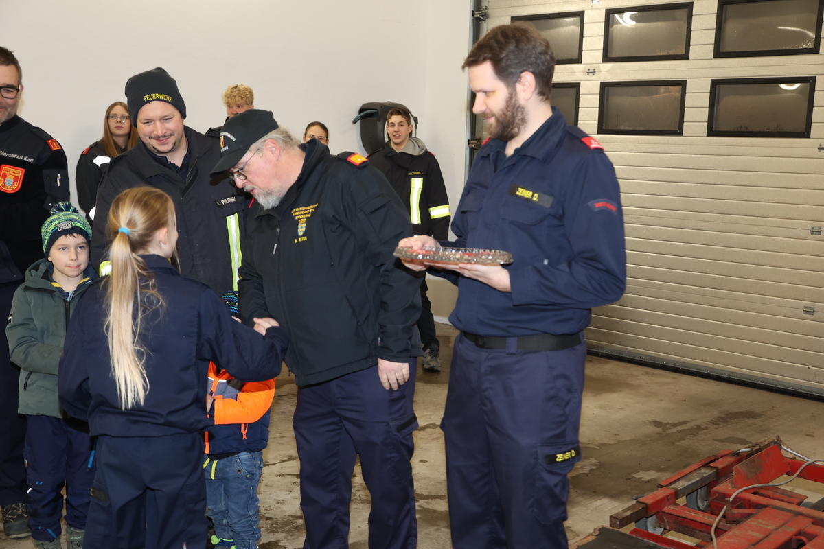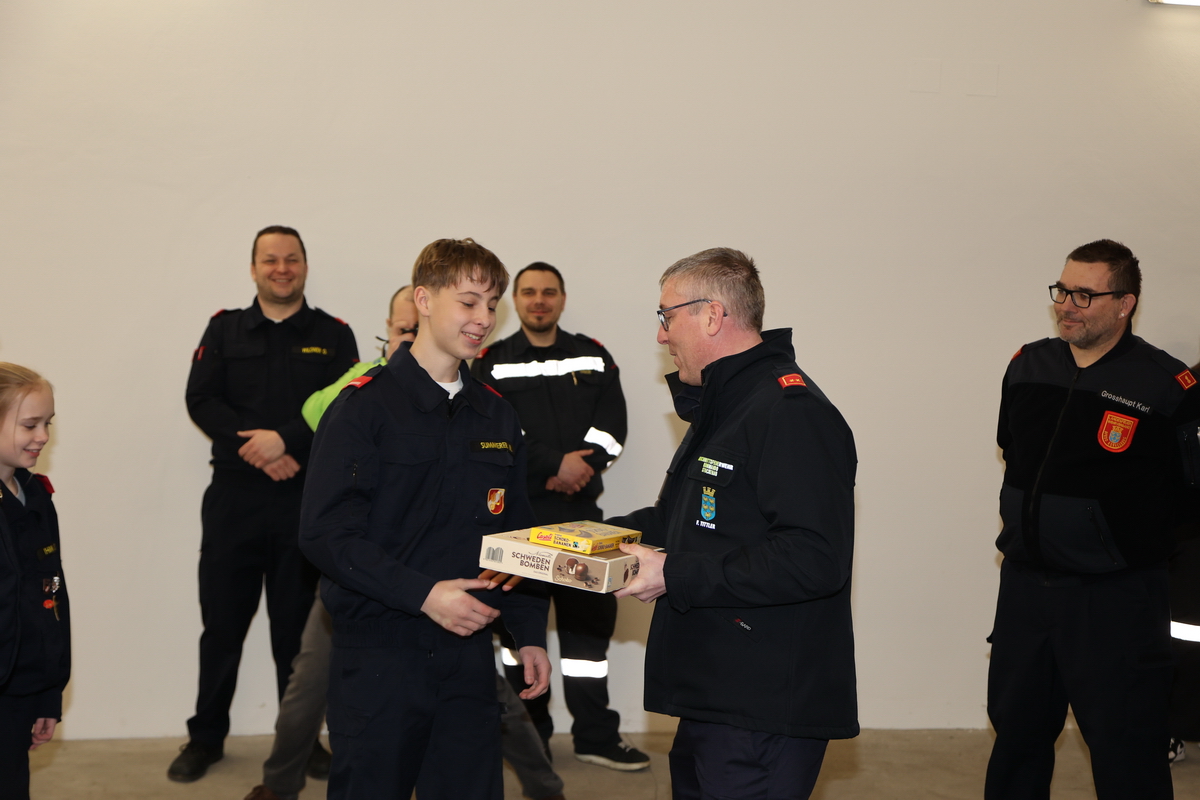 Nach der erfolgreichen Absolvierung des Erprobungsspiel bzw. der 1-3. Erprobung konnten von Abschnittsfeuerwehrkommandantstellvertreter ABI Werner Braun und dem Bezirkssachbearbeiter Feuerwehrjugend BSB Karl „Noko“ Großhaupt die neuen Dienstgrade an die Mädchen und Burschen überreicht werden. Der Stellvertreter des Leiters des Verwaltungsdienstes im Abschnittsfeuerwehrkommando Stockerau OBI Franz Tittler überreichte den Kinder natürlich noch die obligatorischen Schwedenbomben und Schokobananen, welche im Anschluss auch gleich verzehrte wurden.