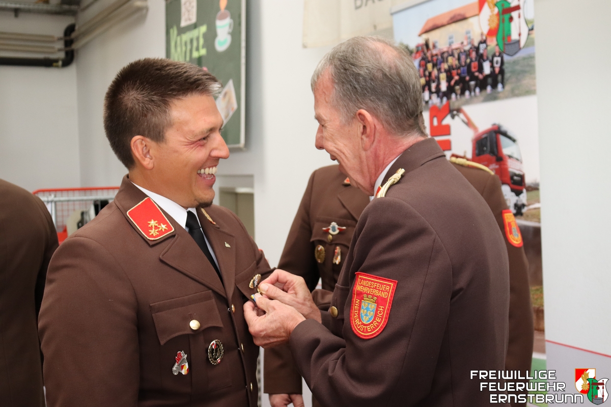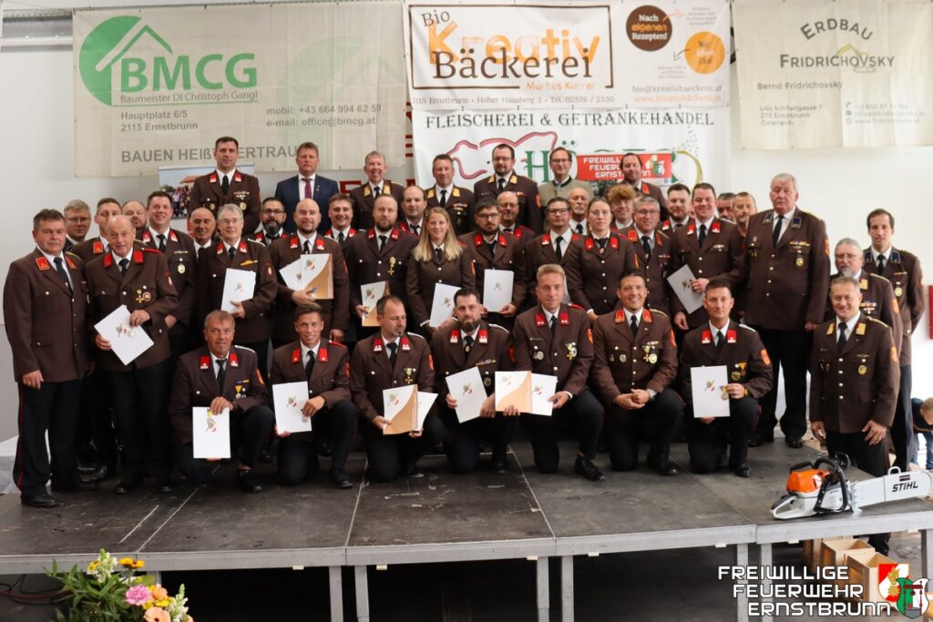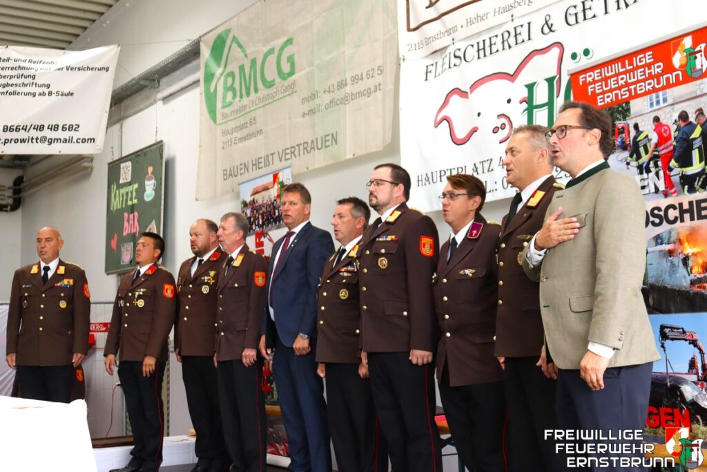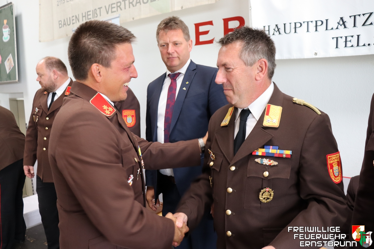 Danach begrüßte Kommandant HBI Mario Liebhart alle anwesenden Gäste und Ehrengäste, darunter Nationalratsabgeordneter Andreas Minnich, Bürgermeister Gerhard Toifl, Bezirksfeuerwehrkommandant des Bezirkes Hollabrunn Landesfeuerwehrrat Alois Zaussinger, Bezirksfeuerwehrkommandant-Stellvertreter Brandrat Hannes Holzer, Abschnittsfeuerwehrkommandant des Abschnittes Korneuburg Brandrat Christoph Nebenführ und dessen Stellvertreter Abschnittsbrandinspektor Karl Böhm. Aus dem benachbarten Feuerwehrabschnitt wurde Abschnittsfeuerwehrkommandant des Abschnittes Stockerau Brandrat Manfred Kreitmayer mit seinem Team willkommen geheißen. Ebenso richtete er seinen Gruß an alle anwesenden Unterabschnittskommandanten sowie die Feuerwehrkommandanten der Marktgemeinde Ernstbrunn. Auch Altbürgermeister und Ehrenabschnittsbrandinspektor Horst Gangl wurde besonders willkommen geheißen.