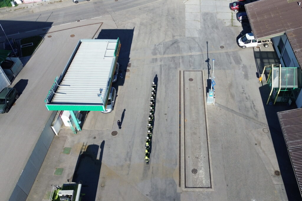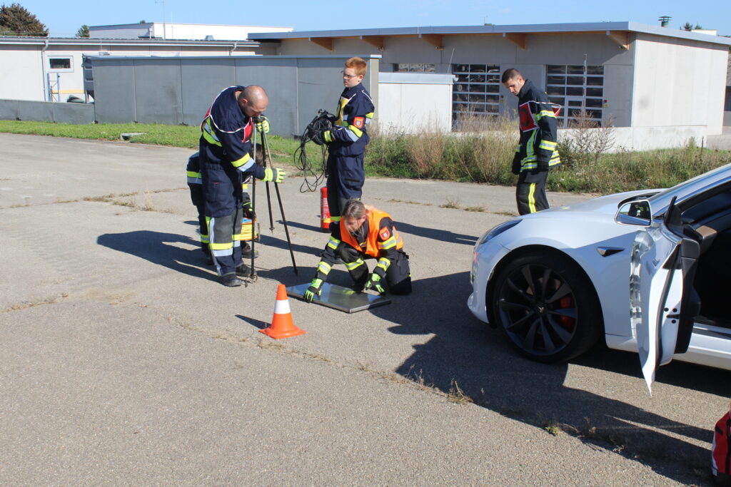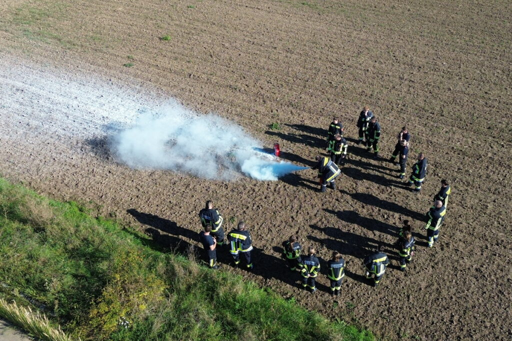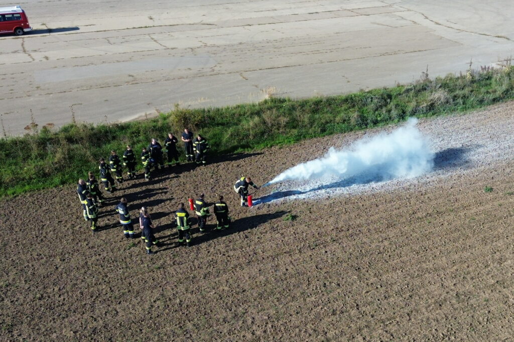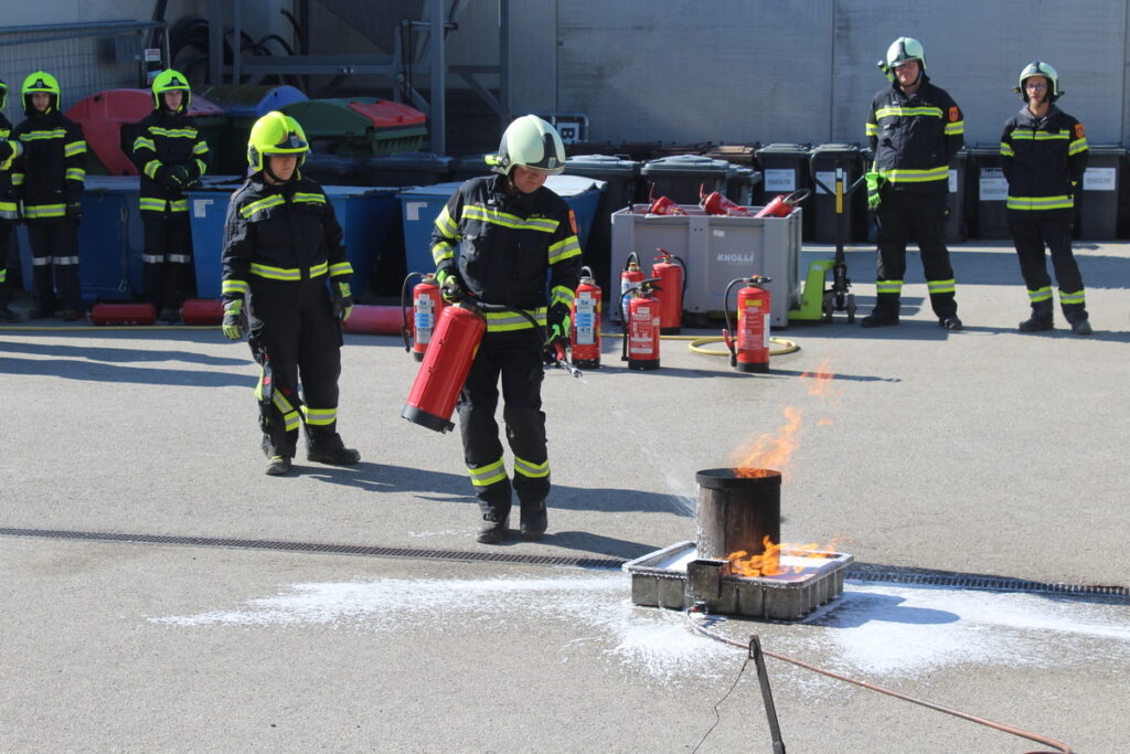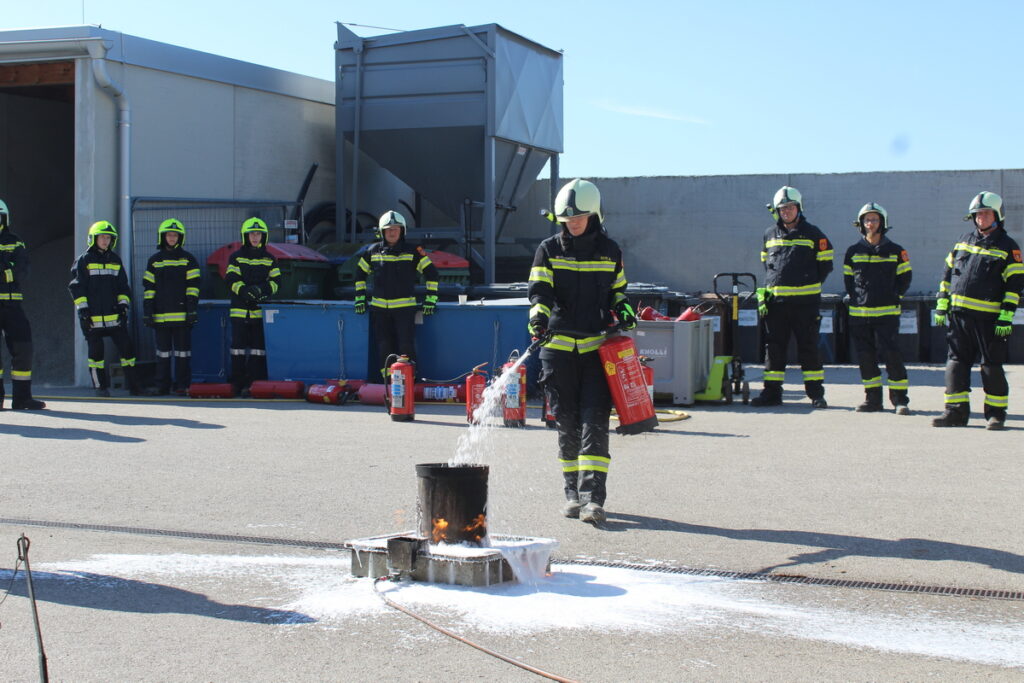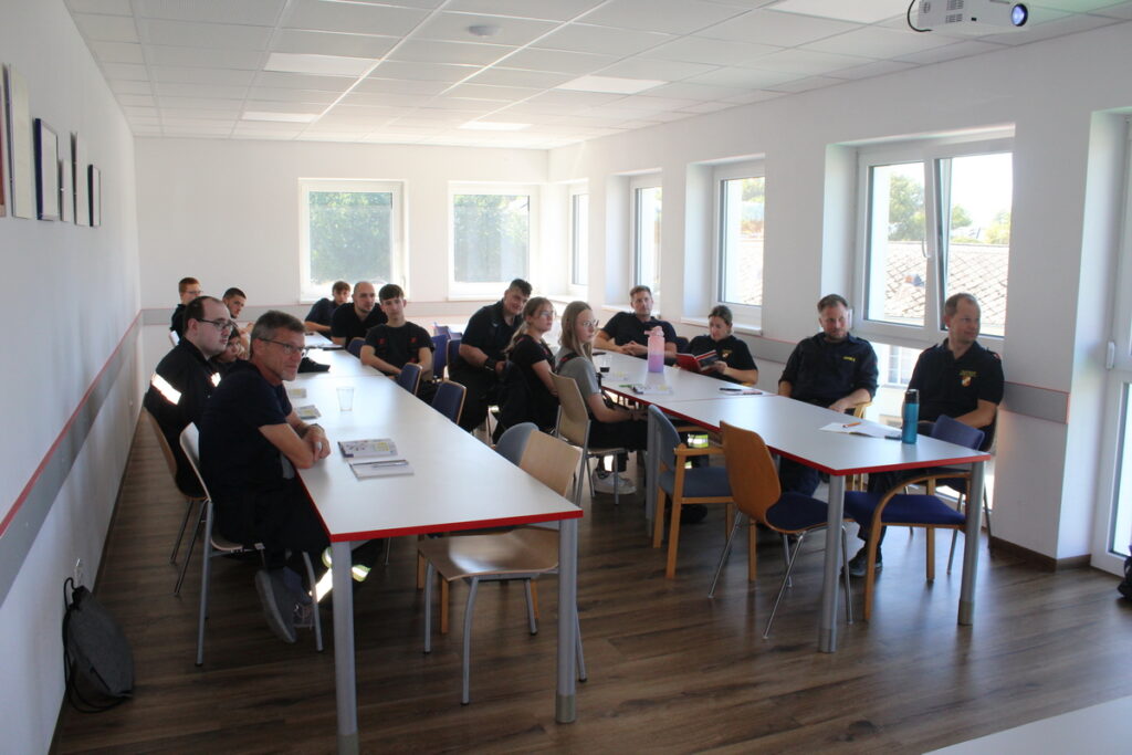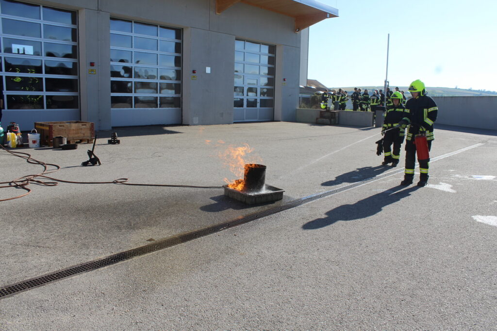 Nach einer kurzen Einweisung stand auch schon das erste Kapitel „Gefahren an der Einsatzstelle“ auf dem Programm. Nach diesem Theorieteil folgten mit den Kleinlöschgeräten und dem Verhalten in der Gruppe zwei praktische Stationen. Der letzte Block vor der Mittagspause war das Absichern der Einsatzstelle.