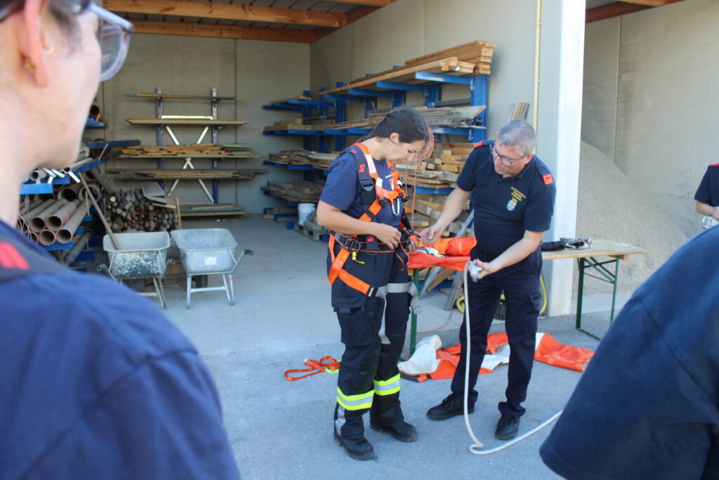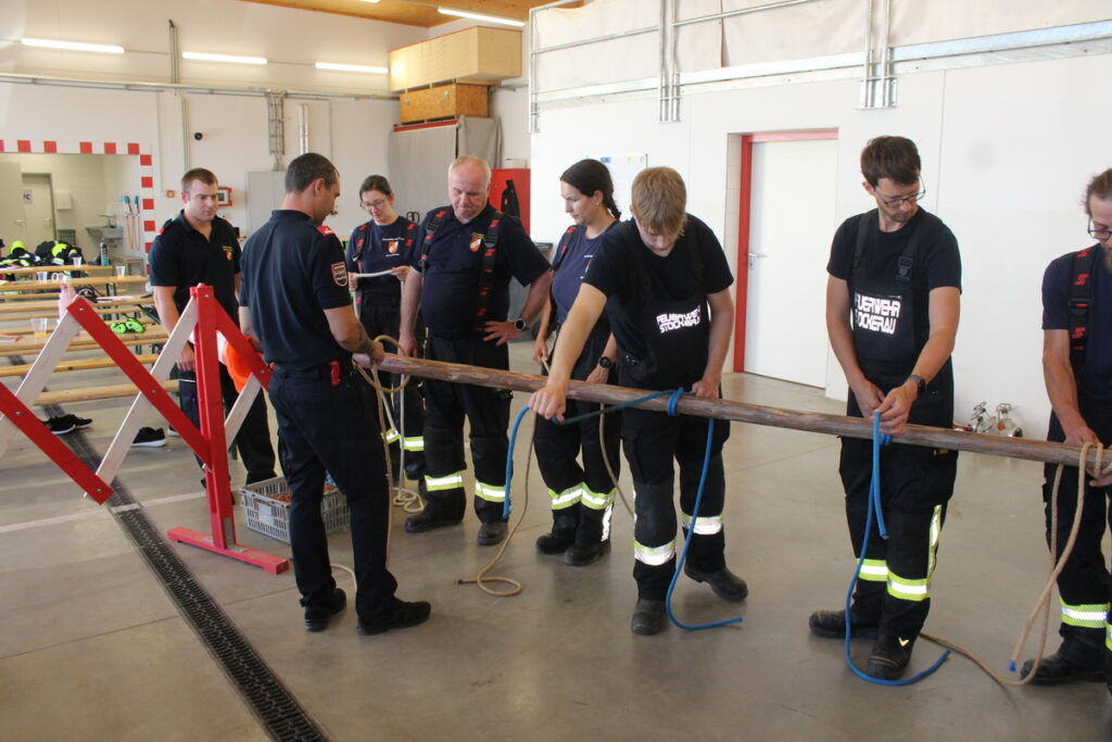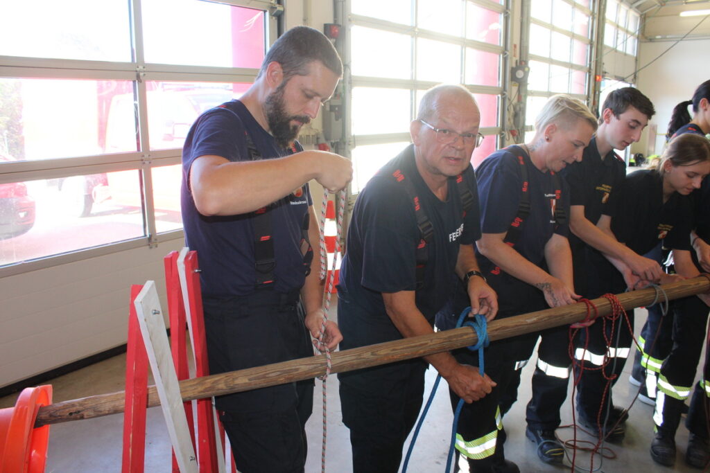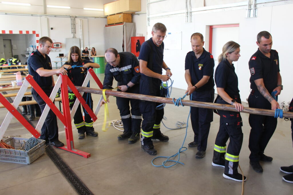Nach der Mittagspause war mit dem Feuerwehreinsatz wieder ein theoretischer Teil an der Reihe, bevor mit den Leinen und Knoten der erste Tag am späteren Nachmittag zu Ende war.