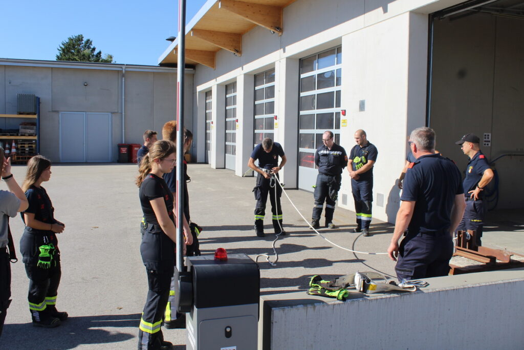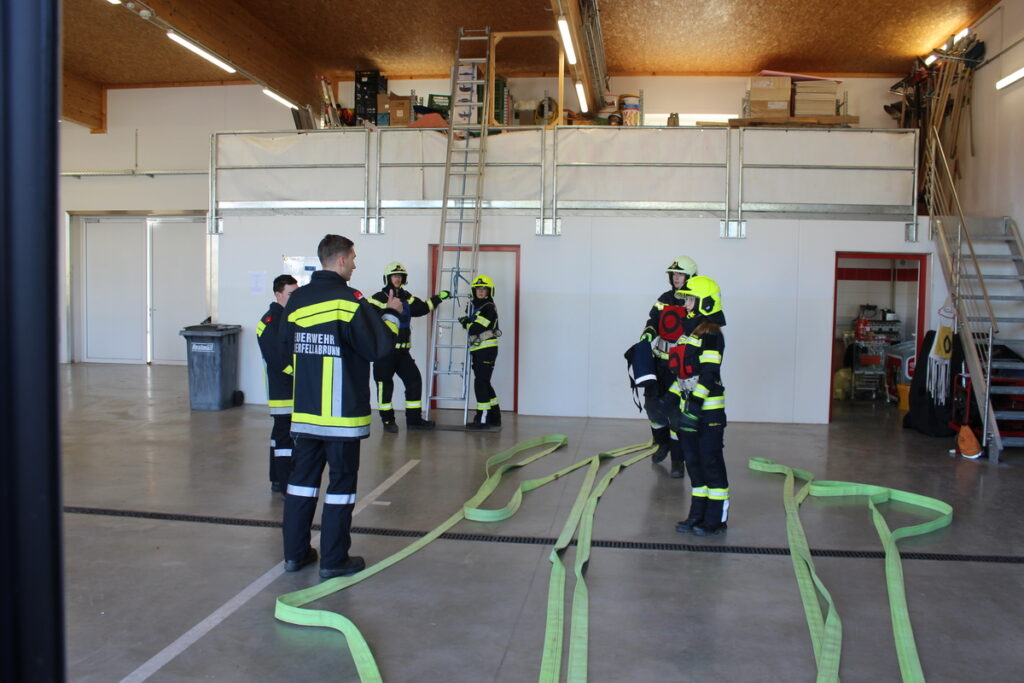 Am zweiten Tag des Feuerwehrbasiswissens standen nun die fehlenden praktischen Stationen auf dem Programm. Herstellen einer Saugleitung, Herstellen einer Löschleitung, Arbeiten mit tragbaren Leitern und die Gruppe im technischen Einsatz waren die Themen. Jeweils 2 Unterrichtseinheiten zu je 50 Minuten waren dafür angesetzt.